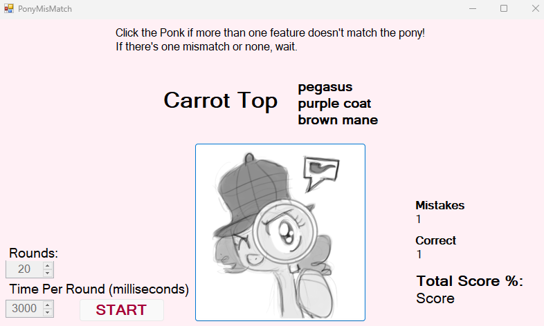 It shows you the name of a character from MLP, and three attributes (pony race, hair color and coat color). If two or three of them don't fit the character, you hit the button. Otherwise, wait for the round timer to run out.